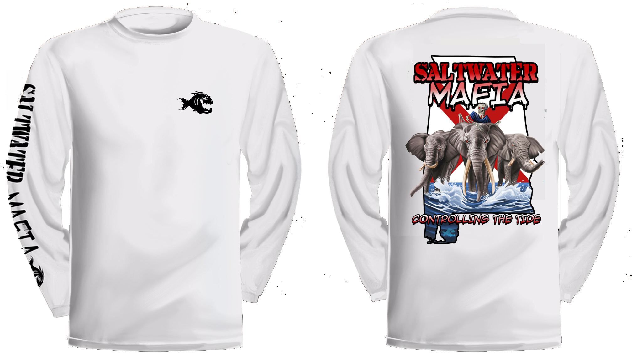 Alabama Elephant long-sleeve quick dry UV protectant shirts. Features ProtectUV (r) for UPF 50+ Mega Solar protection with WIKZ (r) moisture wicking and ZYPTRON (r) stain release. Double Needle Tailoring. Shirt may have Saltwater Mafia or the Mobster Fish on the front chest. Sizes S-3XL. $2 more for 2 & 3 XL. Design is on shirt back. Unisex.