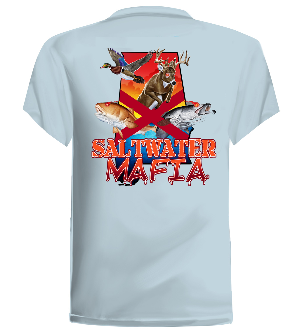 Alabama Outdoors Edition quick dry UV protectant shirts. Features ProtectUV (r) for UPF 50+ Mega Solar protection with WIKZ (r) moisture wicking and ZYPTRON (r) stain release. Double Needle Tailoring. Shirt may have Saltwater Mafia or the Mobster Fish on the front chest. Sizes S-3XL. Design is on shirt back. Unisex.