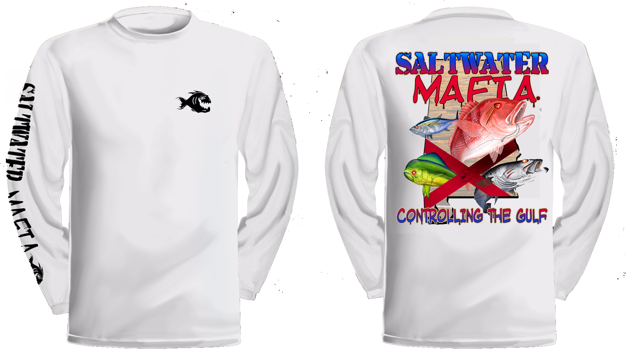 Alabama Gulf long-sleeve quick dry UV protectant shirts. Features ProtectUV (r) for UPF 50+ Mega Solar protection with WIKZ (r) moisture wicking and ZYPTRON (r) stain release. Double Needle Tailoring. Shirt may have Saltwater Mafia or the Mobster Fish on the front chest. Sizes S-3XL. $2 more for 2 & 3 XL. Design is on shirt back. Unisex.