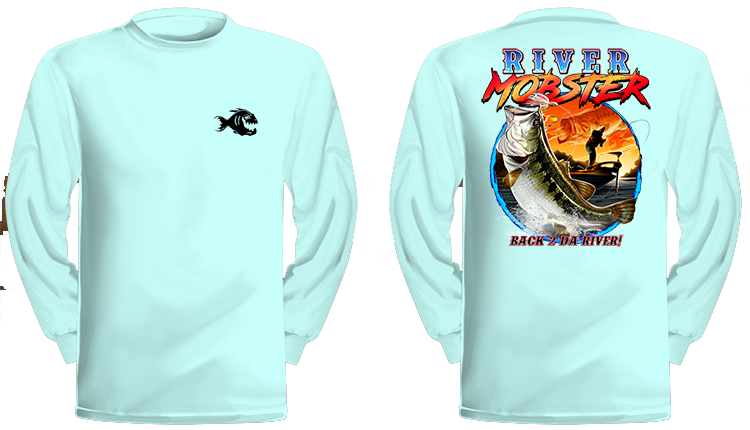 Back 2 Da River long-sleeve quick dry UV protectant shirts. Features ProtectUV (r) for UPF 50+ Mega Solar protection with WIKZ (r) moisture wicking and ZYPTRON (r) stain release. Double Needle Tailoring. Shirt may have Saltwater Mafia or the Mobster Fish on the front chest. Sizes S-3XL. $2 more for 2 & 3 XL. Design is on shirt back. Unisex.