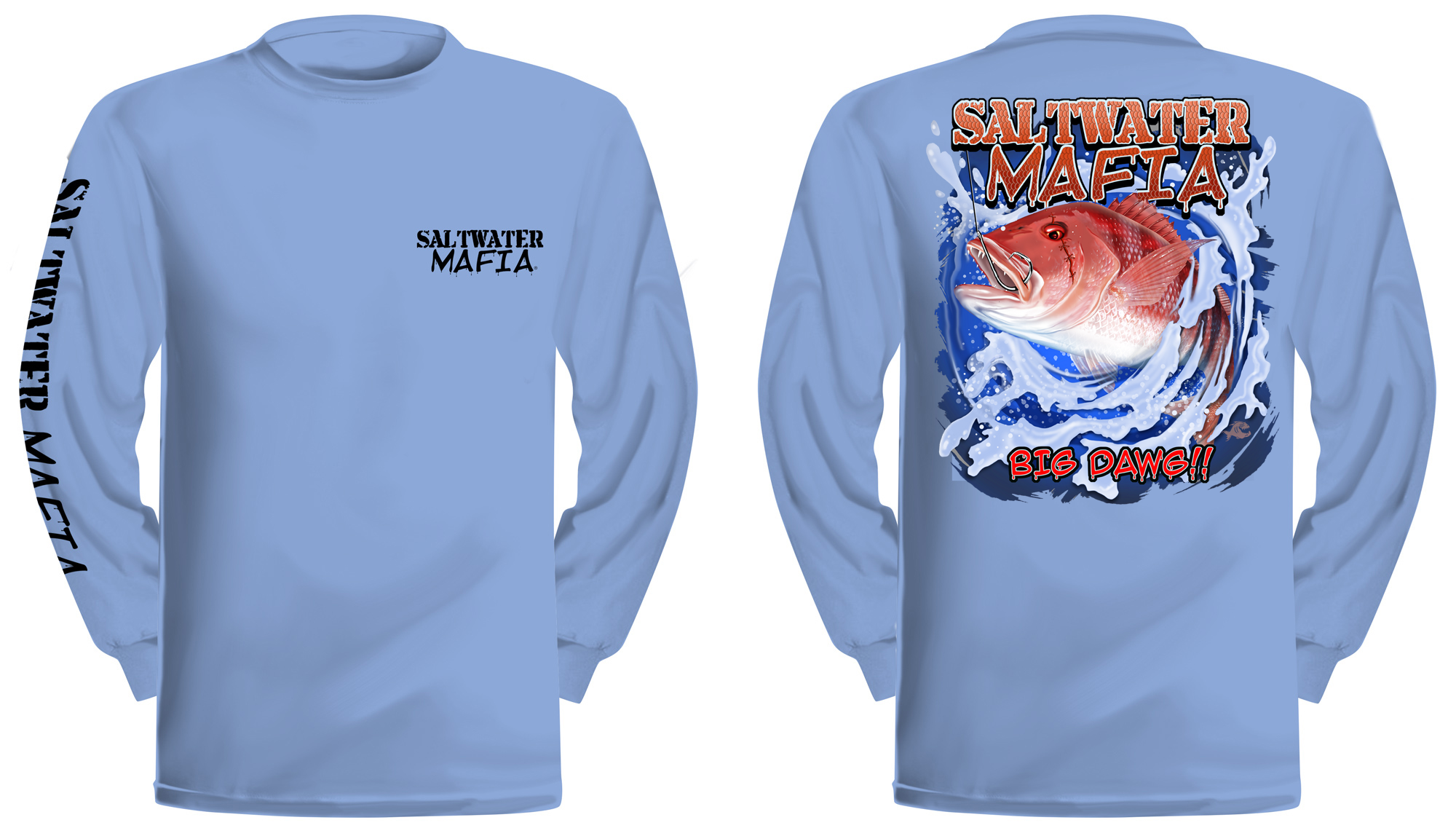 Big Dawg Snapper long-sleeve quick dry UV protectant shirts. Features ProtectUV (r) for UPF 50+ Mega Solar protection with WIKZ (r) moisture wicking and ZYPTRON (r) stain release. Double Needle Tailoring. Shirt may have Saltwater Mafia or the Mobster Fish on the front chest. Sizes S-3XL. $2 more for 2 & 3 XL. Design is on shirt back. Unisex.