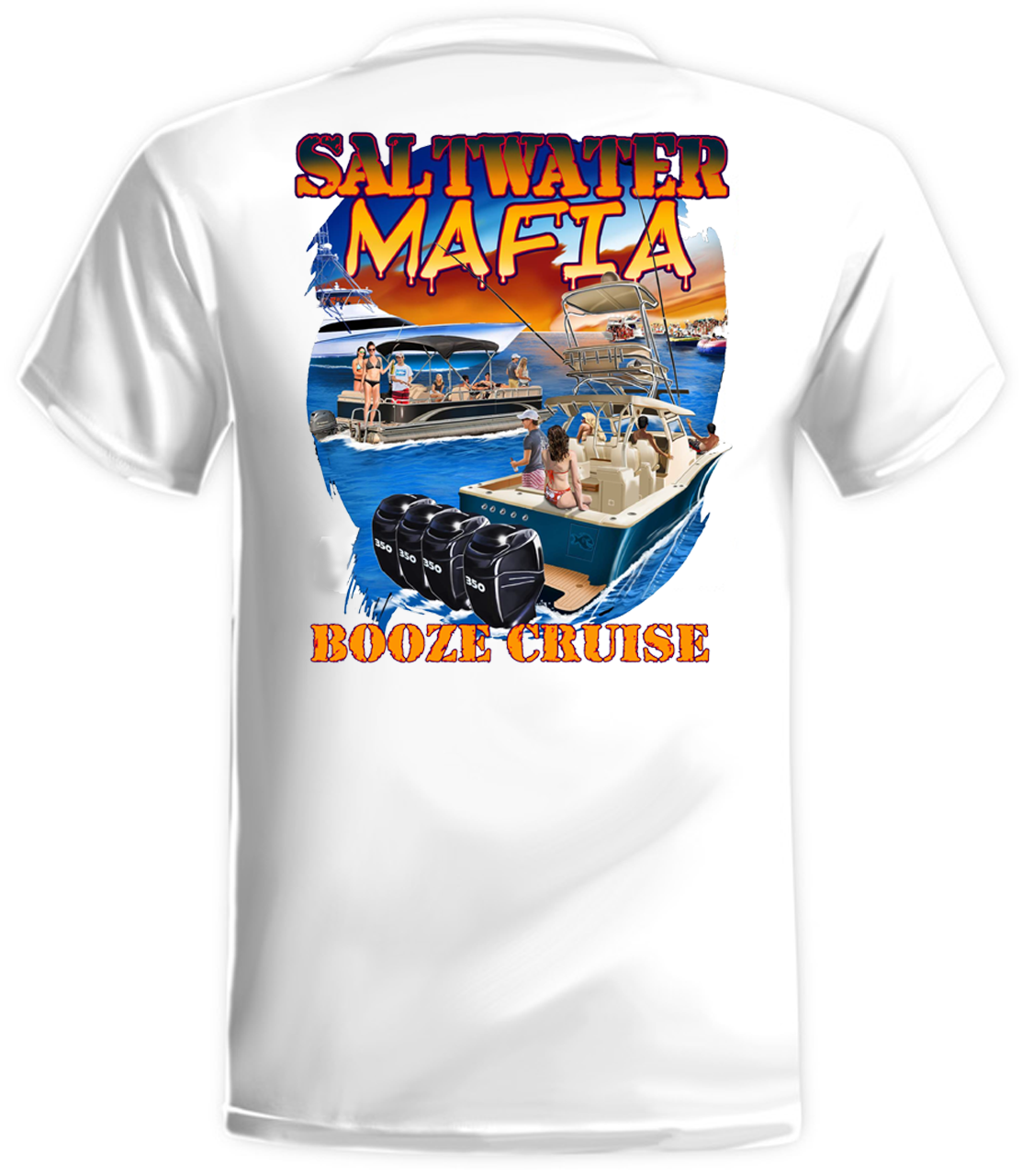 Booze Cruise quick dry UV protectant shirts. Features ProtectUV (r) for UPF 50+ Mega Solar protection with WIKZ (r) moisture wicking and ZYPTRON (r) stain release. Double Needle Tailoring. Shirt may have Saltwater Mafia or the Mobster Fish on the front chest. Sizes S-3XL. $2 more for 2 & 3 XL. Design is on shirt back. Unisex.