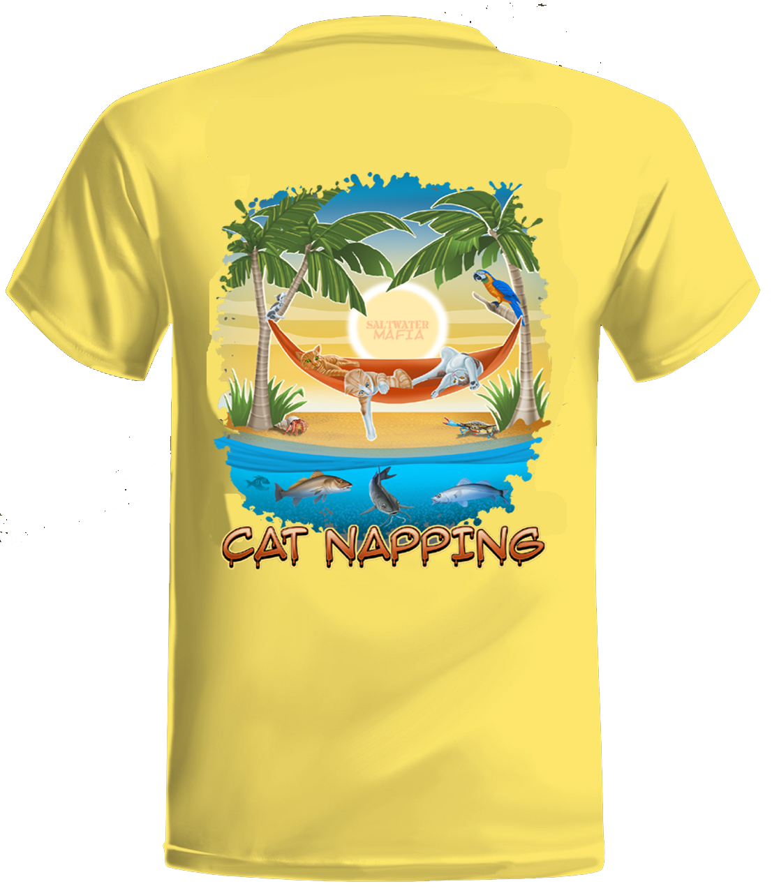 Cat Napping quick dry UV protectant shirts. Features ProtectUV (r) for UPF 50+ Mega Solar protection with WIKZ (r) moisture wicking and ZYPTRON (r) stain release. Double Needle Tailoring. Shirt may have Saltwater Mafia or the Mobster Fish on the front chest. Sizes S-3XL. Design is on shirt back. Unisex.