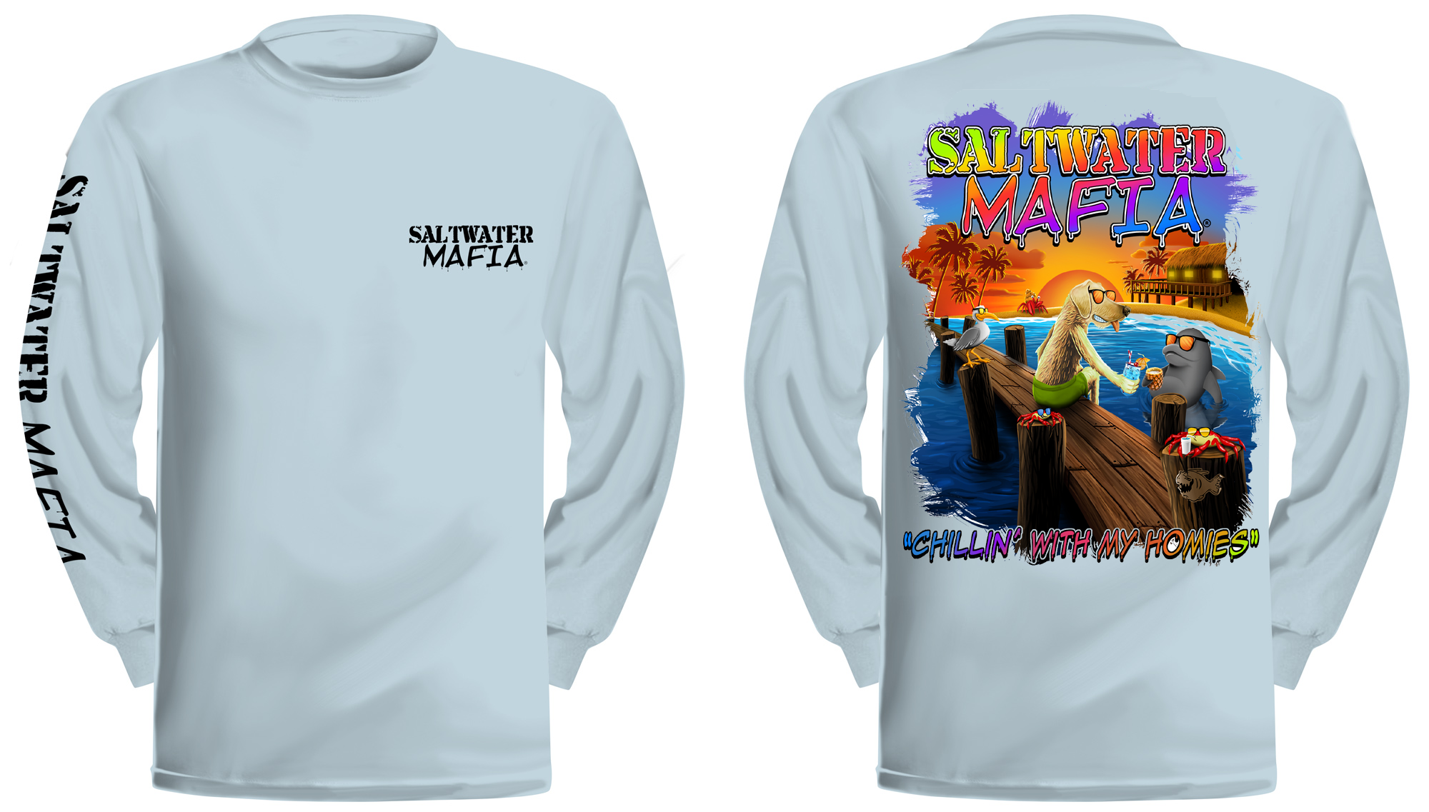 Chillin With Homies long-sleeve quick dry UV protectant shirts. Features ProtectUV (r) for UPF 50+ Mega Solar protection with WIKZ (r) moisture wicking and ZYPTRON (r) stain release. Double Needle Tailoring. Shirt may have Saltwater Mafia or the Mobster Fish on the front chest. Sizes S-3XL. $2 more for 2 & 3 XL. Design is on shirt back. Unisex.