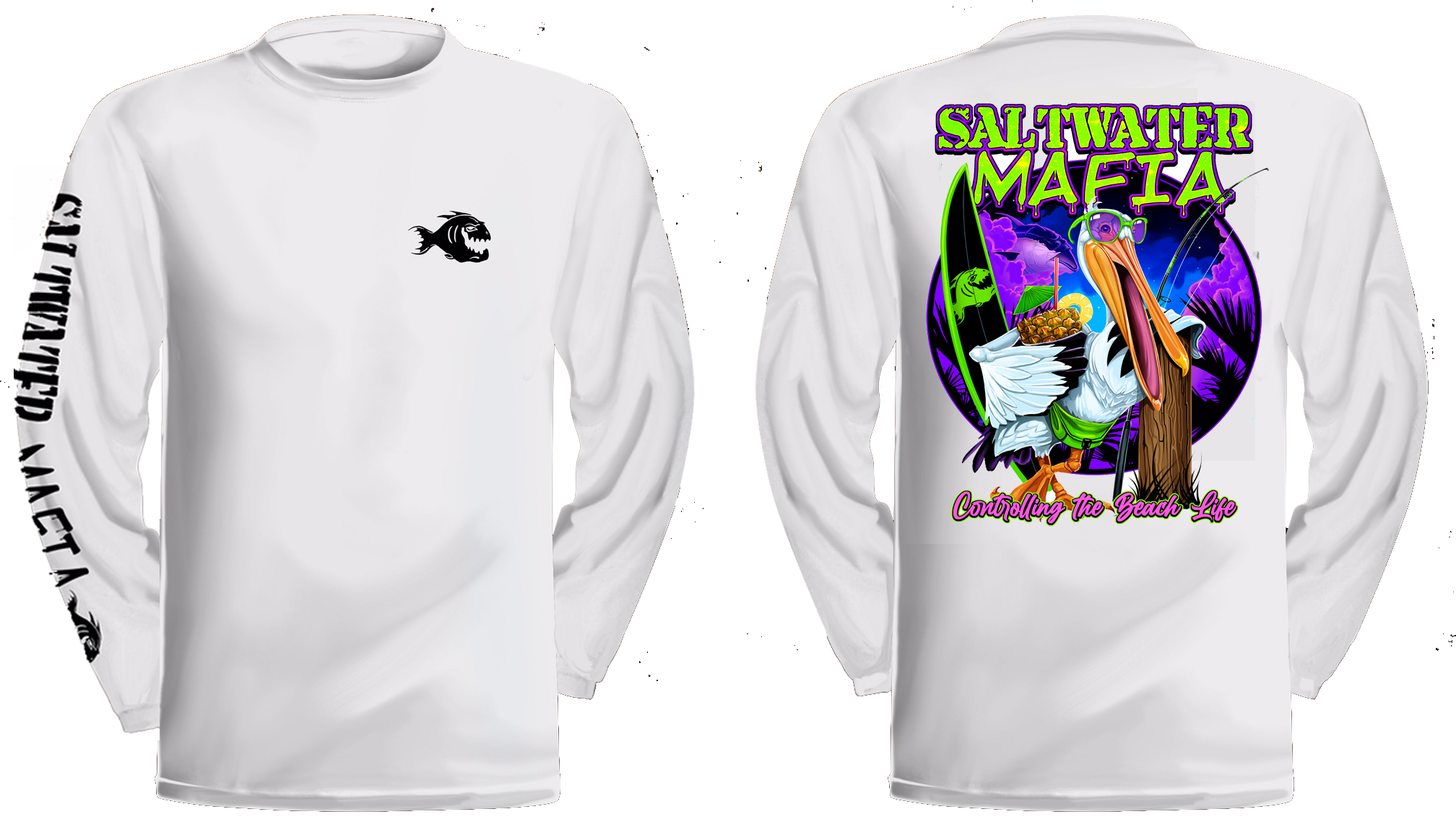 Controlling the Beach Life long-sleeve quick dry UV protectant shirts. Features ProtectUV (r) for UPF 50+ Mega Solar protection with WIKZ (r) moisture wicking and ZYPTRON (r) stain release. Double Needle Tailoring. Shirt may have Saltwater Mafia or the Mobster Fish on the front chest. Sizes S-3XL. $2 more for 2 & 3 XL. Design is on shirt back. Unisex.