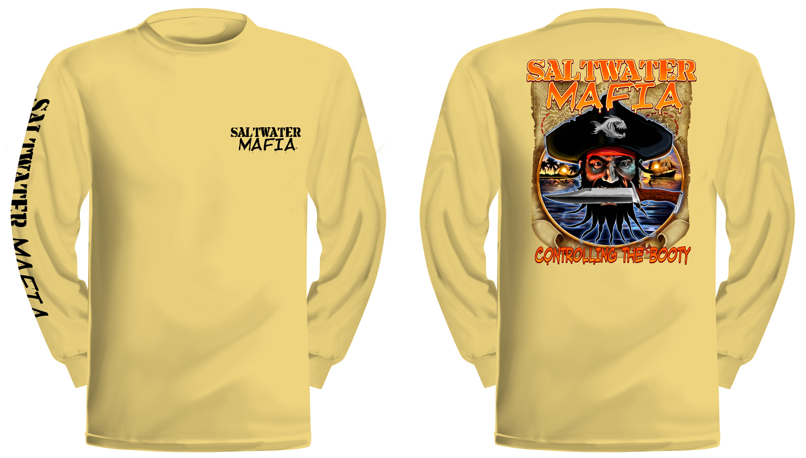 Controlling The Booty long-sleeve quick dry UV protectant shirts. Features ProtectUV (r) for UPF 50+ Mega Solar protection with WIKZ (r) moisture wicking and ZYPTRON (r) stain release. Double Needle Tailoring. Shirt may have Saltwater Mafia or the Mobster Fish on the front chest. Sizes S-3XL. $2 more for 2 & 3 XL. Design is on shirt back. Unisex.