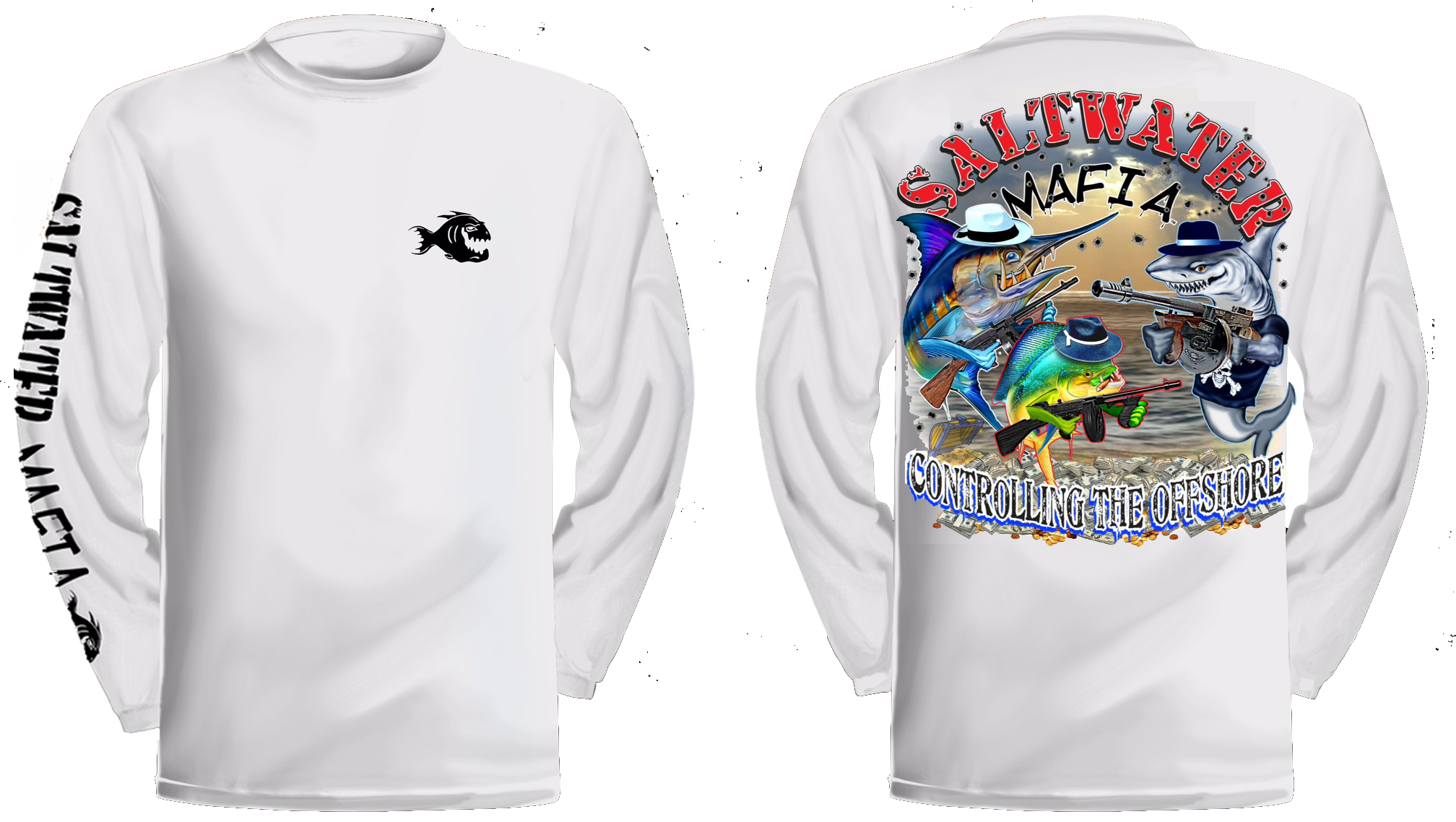 Da Gang long-sleeve quick dry UV protectant shirts. Features ProtectUV (r) for UPF 50+ Mega Solar protection with WIKZ (r) moisture wicking and ZYPTRON (r) stain release. Double Needle Tailoring. Shirt may have Saltwater Mafia or the Mobster Fish on the front chest. Sizes S-3XL. $2 more for 2 & 3 XL. Design is on shirt back. Unisex.