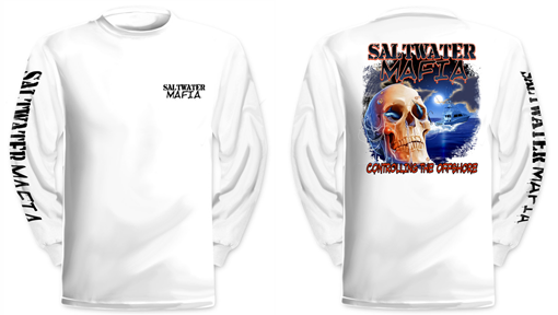 Da Skull long-sleeve quick dry UV protectant shirts. Features ProtectUV (r) for UPF 50+ Mega Solar protection with WIKZ (r) moisture wicking and ZYPTRON (r) stain release. Double Needle Tailoring. Shirt may have Saltwater Mafia or the Mobster Fish on the front chest. Sizes S-3XL. $2 more for 2 & 3 XL. Design is on shirt back. Unisex.