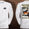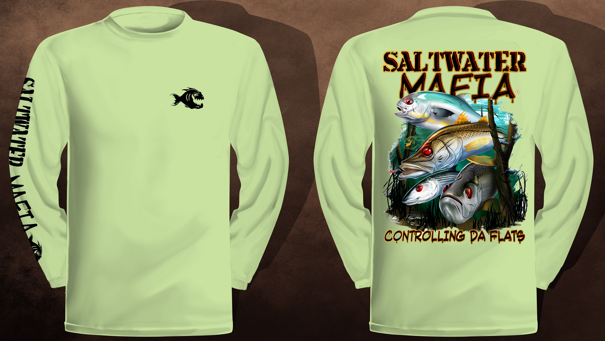 Da Flats long-sleeve quick dry UV protectant shirts. Features ProtectUV (r) for UPF 50+ Mega Solar protection with WIKZ (r) moisture wicking and ZYPTRON (r) stain release. Double Needle Tailoring. Shirt may have Saltwater Mafia or the Mobster Fish on the front chest. Sizes S-3XL. $2 more for 2 & 3 XL. Design is on shirt back. Unisex.
