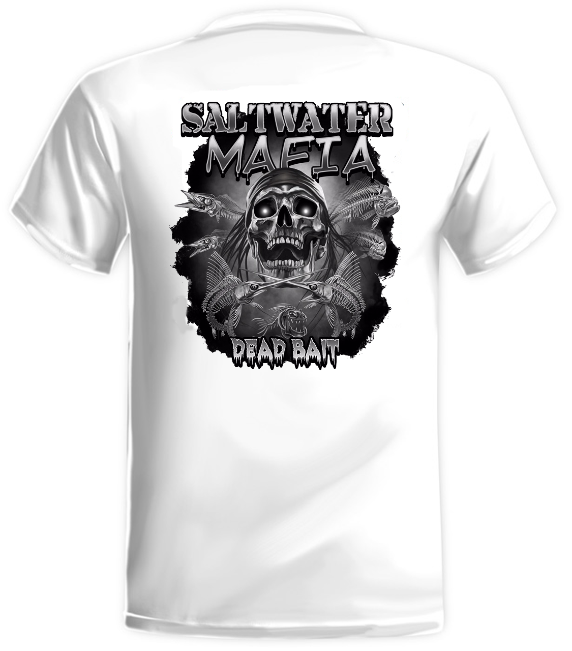 Dead Bait quick dry UV protectant shirts. Features ProtectUV (r) for UPF 50+ Mega Solar protection with WIKZ (r) moisture wicking and ZYPTRON (r) stain release. Double Needle Tailoring. Shirt may have Saltwater Mafia or the Mobster Fish on the front chest. Sizes S-3XL. $2 more for 2 & 3 XL. Design is on shirt back. Unisex.