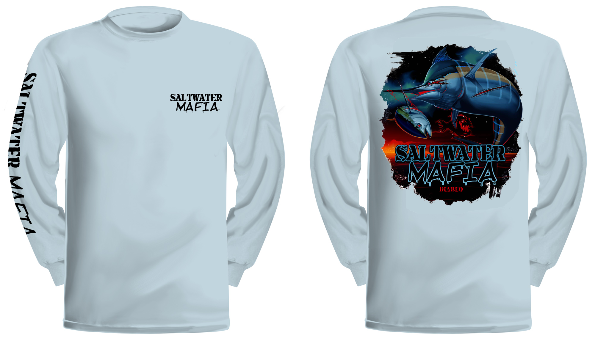 Diablo Marlin long-sleeve quick dry UV protectant shirts. Features ProtectUV (r) for UPF 50+ Mega Solar protection with WIKZ (r) moisture wicking and ZYPTRON (r) stain release. Double Needle Tailoring. Shirt may have Saltwater Mafia or the Mobster Fish on the front chest. Sizes S-3XL. $2 more for 2 & 3 XL. Design is on shirt back. Unisex.