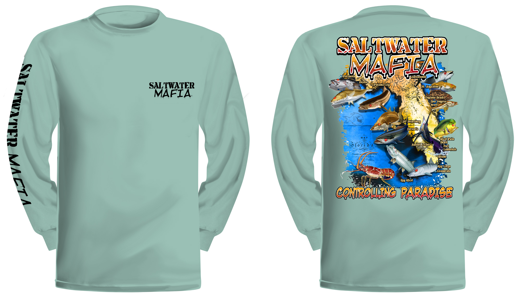 Florida long-sleeve quick dry UV protectant shirts. Features ProtectUV (r) for UPF 50+ Mega Solar protection with WIKZ (r) moisture wicking and ZYPTRON (r) stain release. Double Needle Tailoring. Shirt may have Saltwater Mafia or the Mobster Fish on the front chest. Sizes S-3XL. $2 more for 2 & 3 XL. Design is on shirt back. Unisex.