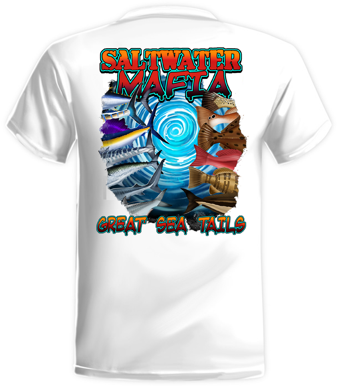 Great Sea Tails quick dry UV protectant shirts. Features ProtectUV (r) for UPF 50+ Mega Solar protection with WIKZ (r) moisture wicking and ZYPTRON (r) stain release. Double Needle Tailoring. Shirt may have Saltwater Mafia or the Mobster Fish on the front chest. Sizes S-3XL. Design is on shirt back. Unisex.