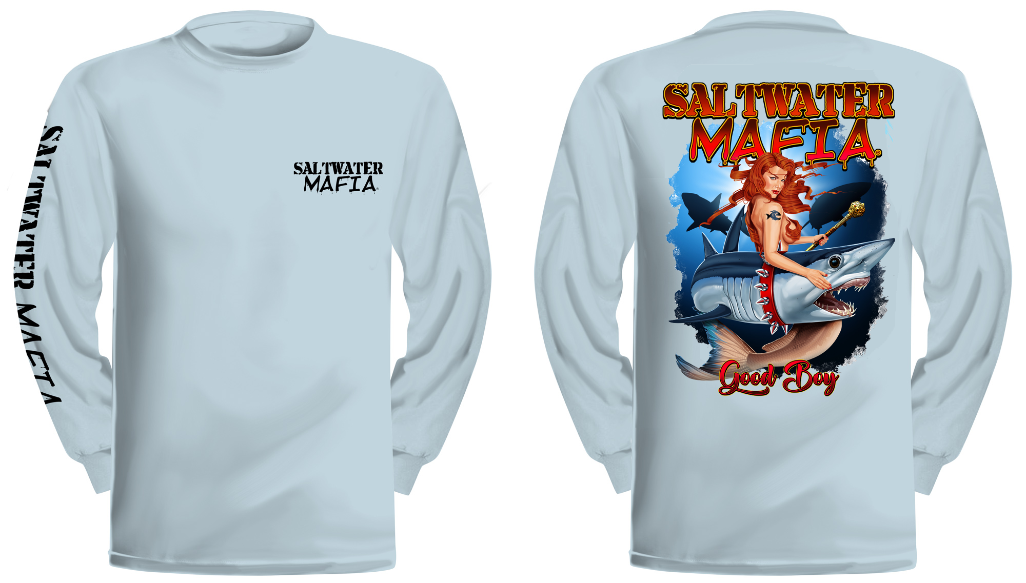 Good Boy long-sleeve quick dry UV protectant shirts. Features ProtectUV (r) for UPF 50+ Mega Solar protection with WIKZ (r) moisture wicking and ZYPTRON (r) stain release. Double Needle Tailoring. Shirt may have Saltwater Mafia or the Mobster Fish on the front chest. Sizes S-3XL. $2 more for 2 & 3 XL. Design is on shirt back. Unisex.