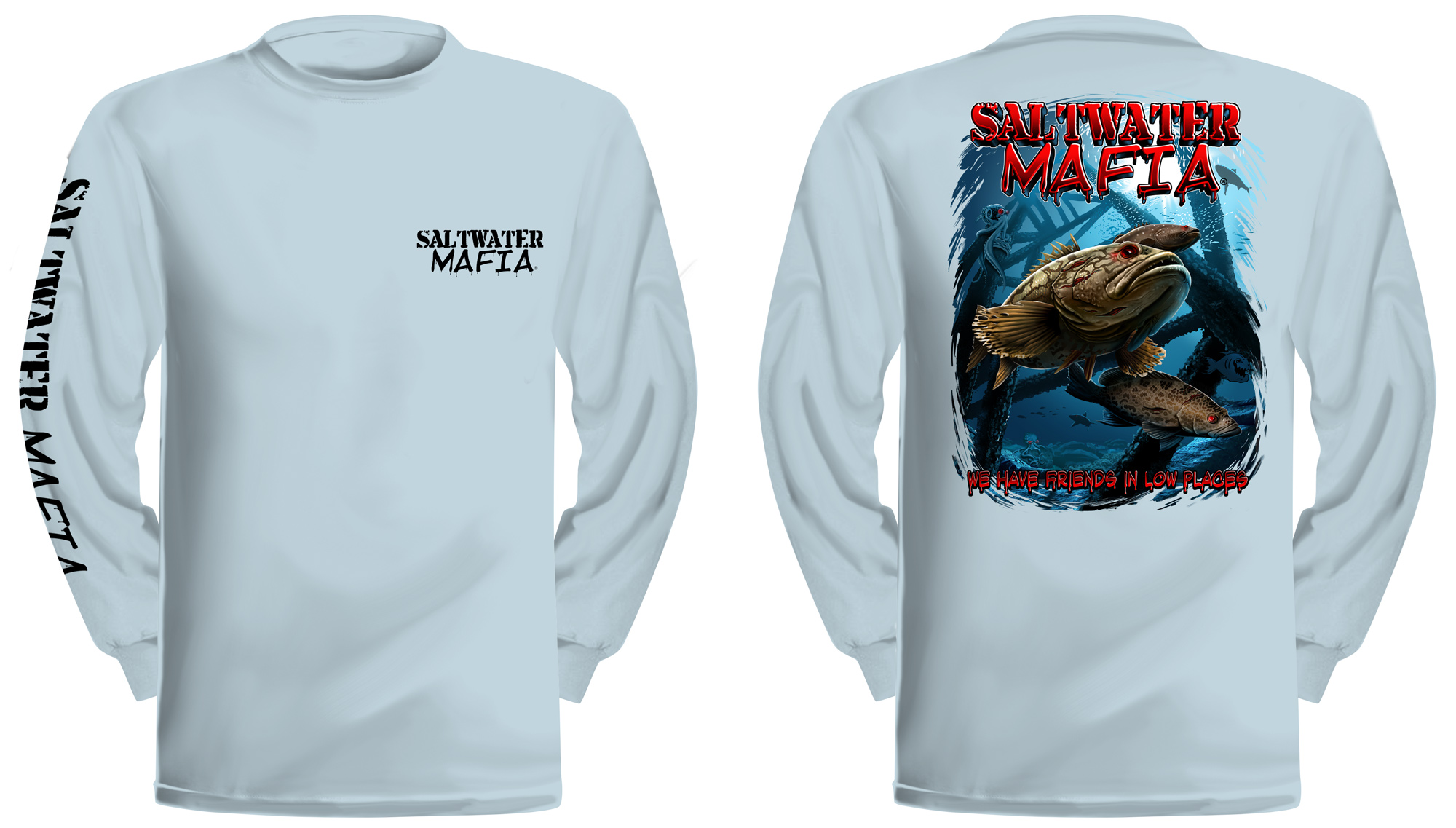 Grouper long-sleeve quick dry UV protectant shirts. Features ProtectUV (r) for UPF 50+ Mega Solar protection with WIKZ (r) moisture wicking and ZYPTRON (r) stain release. Double Needle Tailoring. Shirt may have Saltwater Mafia or the Mobster Fish on the front chest. Sizes S-3XL. $2 more for 2 & 3 XL. Design is on shirt back. Unisex.