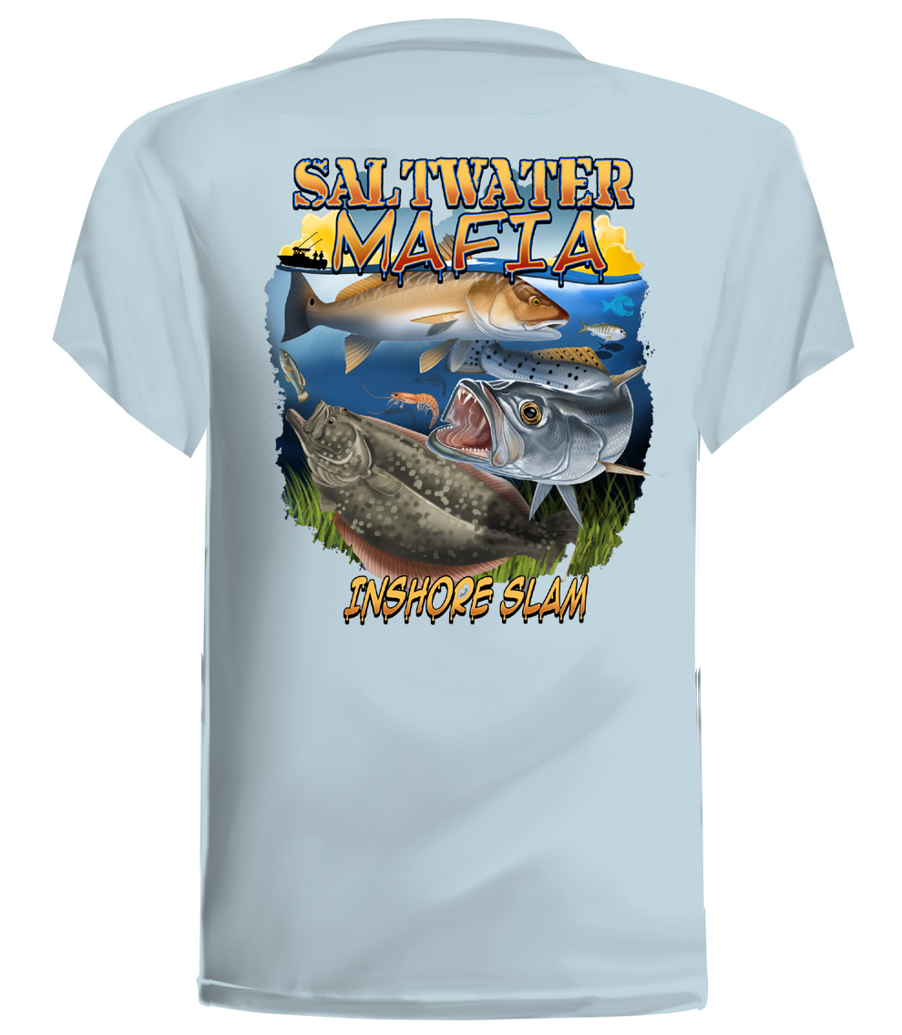 Inshore Slam quick dry UV protectant shirts. Features ProtectUV (r) for UPF 50+ Mega Solar protection with WIKZ (r) moisture wicking and ZYPTRON (r) stain release. Double Needle Tailoring. Shirt may have Saltwater Mafia or the Mobster Fish on the front chest. Sizes S-3XL. Design is on shirt back. Unisex.