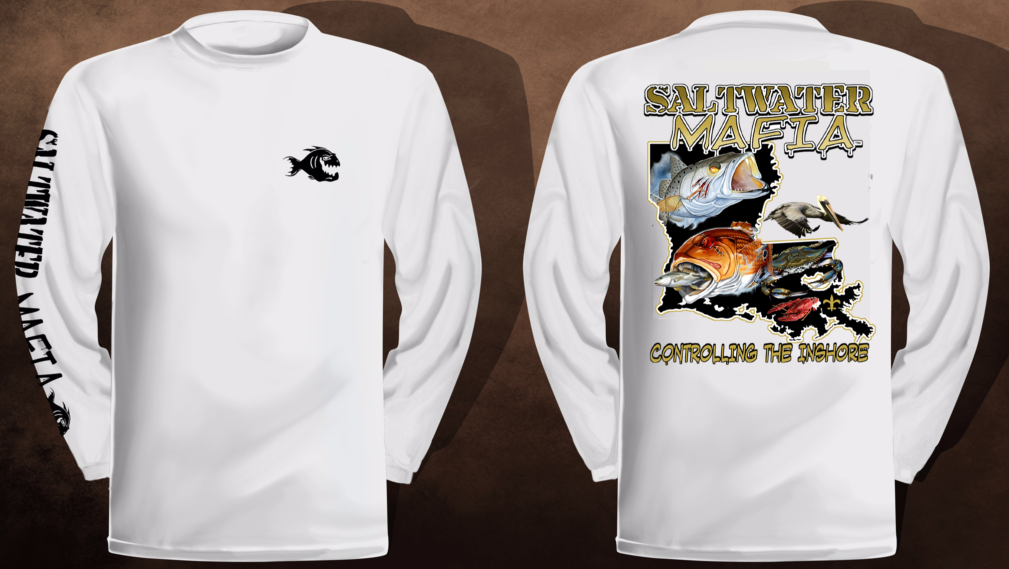 Louisiana long-sleeve quick dry UV protectant shirts. Features ProtectUV (r) for UPF 50+ Mega Solar protection with WIKZ (r) moisture wicking and ZYPTRON (r) stain release. Double Needle Tailoring. Shirt may have Saltwater Mafia or the Mobster Fish on the front chest. Sizes S-3XL. $2 more for 2 & 3 XL. Design is on shirt back. Unisex.