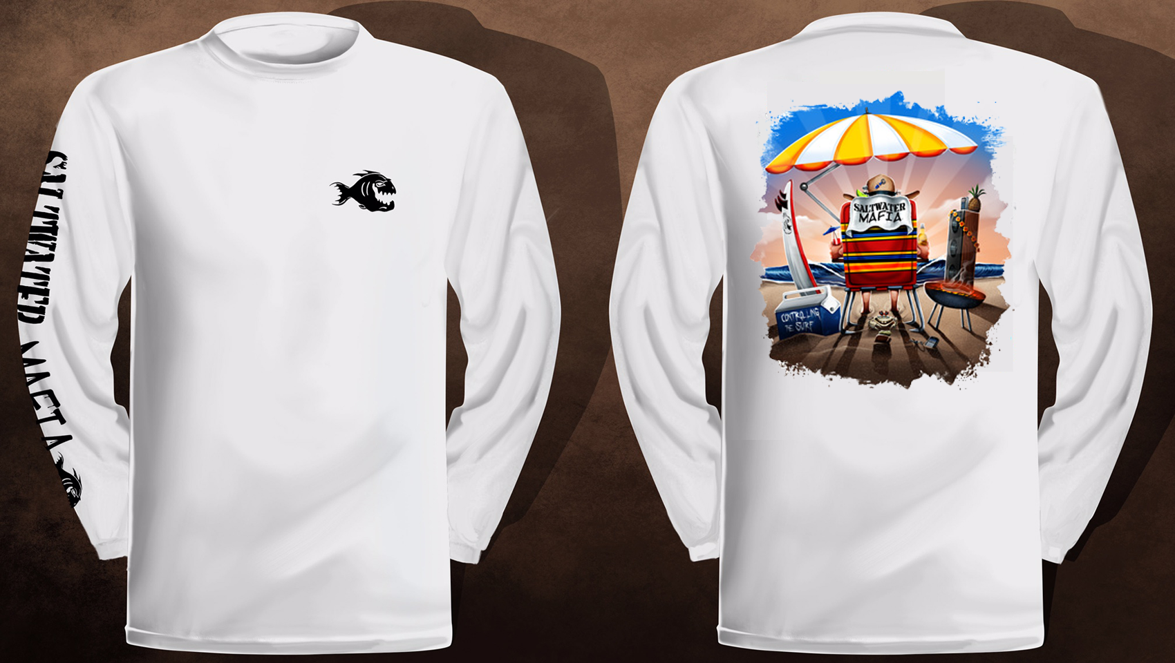 Mafia Chillaxin long-sleeve quick dry UV protectant shirts. Features ProtectUV (r) for UPF 50+ Mega Solar protection with WIKZ (r) moisture wicking and ZYPTRON (r) stain release. Double Needle Tailoring. Shirt may have Saltwater Mafia or the Mobster Fish on the front chest. Sizes S-3XL. $2 more for 2 & 3 XL. Design is on shirt back. Unisex.