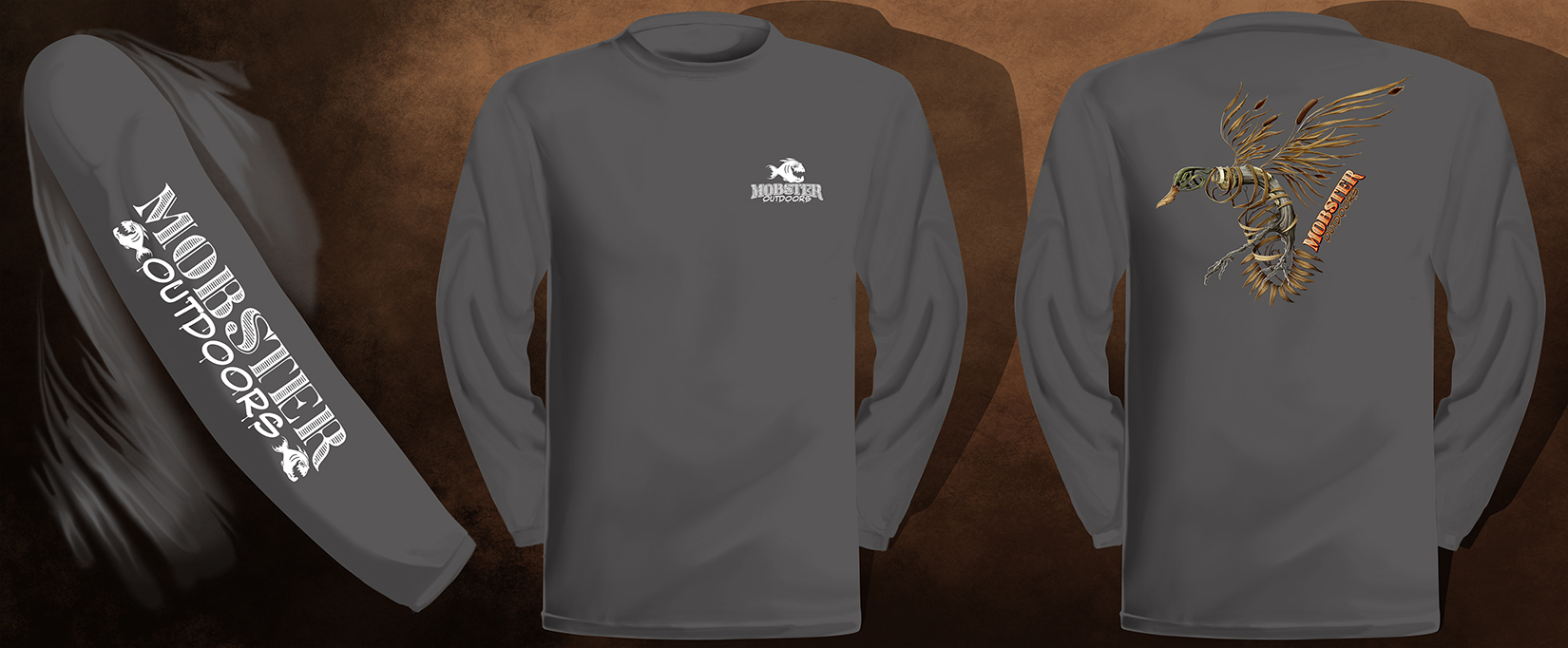 Mobster Outdoors Duck long-sleeve quick dry UV protectant shirts. Features ProtectUV (r) for UPF 50+ Mega Solar protection with WIKZ (r) moisture wicking and ZYPTRON (r) stain release. Double Needle Tailoring. Shirt may have Saltwater Mafia or the Mobster Fish on the front chest. Sizes S-3XL. $2 more for 2 & 3 XL. Design is on shirt back. Unisex.
