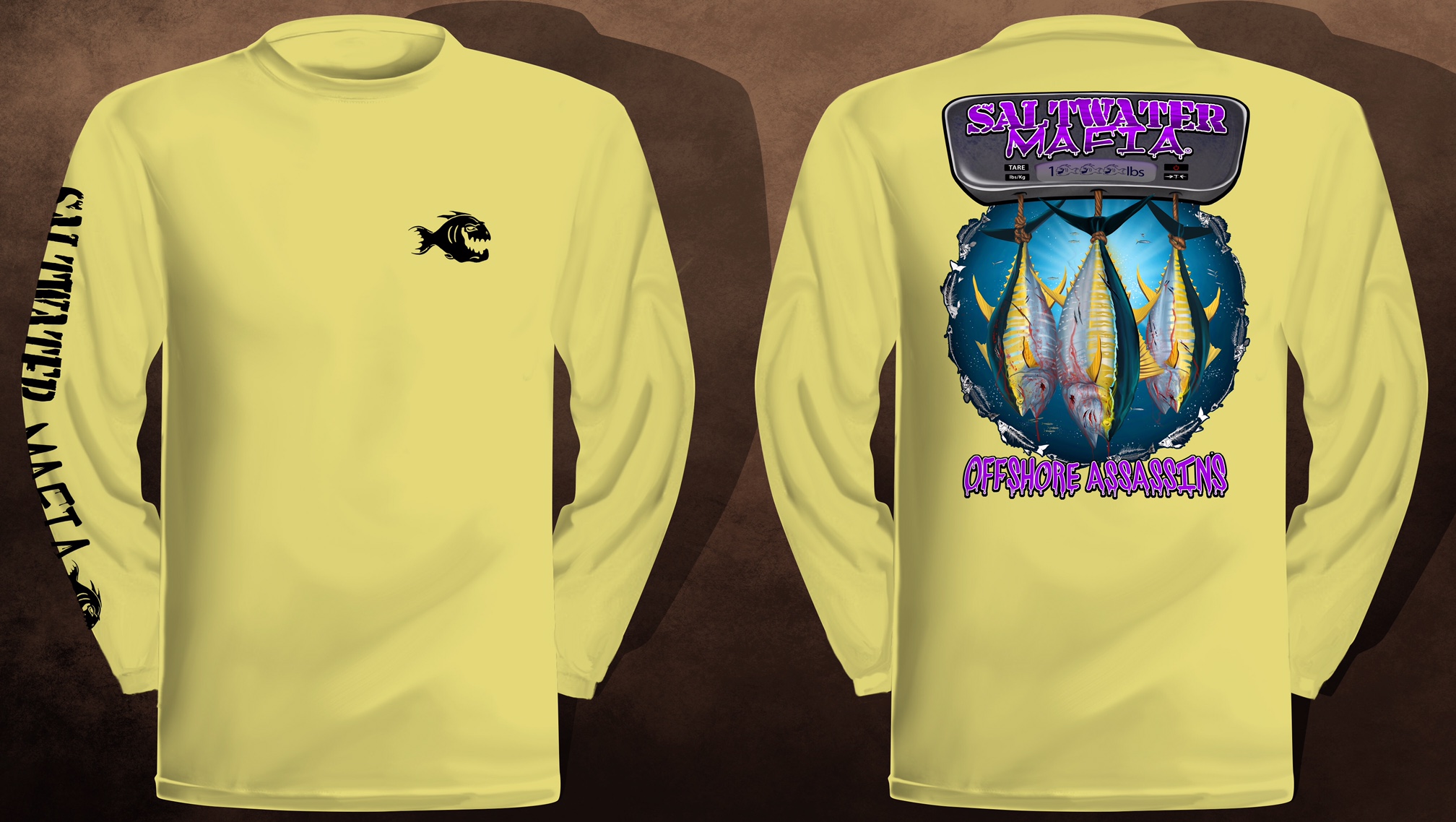 Offshore Assassin long-sleeve quick dry UV protectant shirts. Features ProtectUV (r) for UPF 50+ Mega Solar protection with WIKZ (r) moisture wicking and ZYPTRON (r) stain release. Double Needle Tailoring. Shirt may have Saltwater Mafia or the Mobster Fish on the front chest. Sizes S-3XL. $2 more for 2 & 3 XL. Design is on shirt back. Unisex.