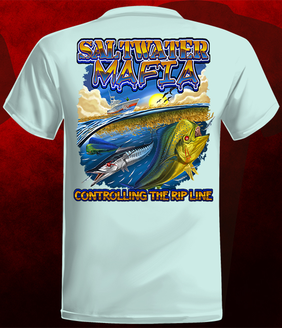 Rip Line Short Sleeve quick dry UV protectant shirts. Features ProtectUV (r) for UPF 50+ Mega Solar protection with WIKZ (r) moisture wicking and ZYPTRON (r) stain release. Double Needle Tailoring. Shirt may have Saltwater Mafia or the Mobster Fish on the front chest. Sizes S-3XL. $2 more for 2 & 3 XL. Design is on shirt back. Unisex.