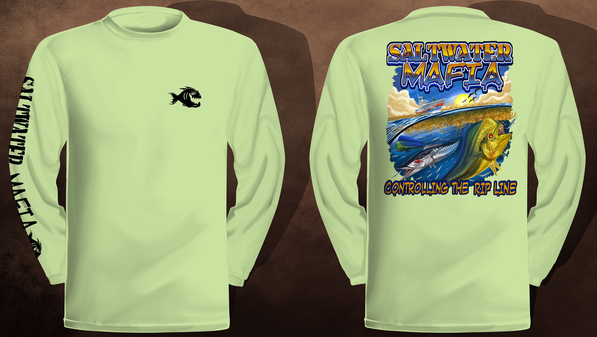 Rip Line long-sleeve quick dry UV protectant shirts. Features ProtectUV (r) for UPF 50+ Mega Solar protection with WIKZ (r) moisture wicking and ZYPTRON (r) stain release. Double Needle Tailoring. Shirt may have Saltwater Mafia or the Mobster Fish on the front chest. Sizes S-3XL. $2 more for 2 & 3 XL. Design is on shirt back. Unisex.
