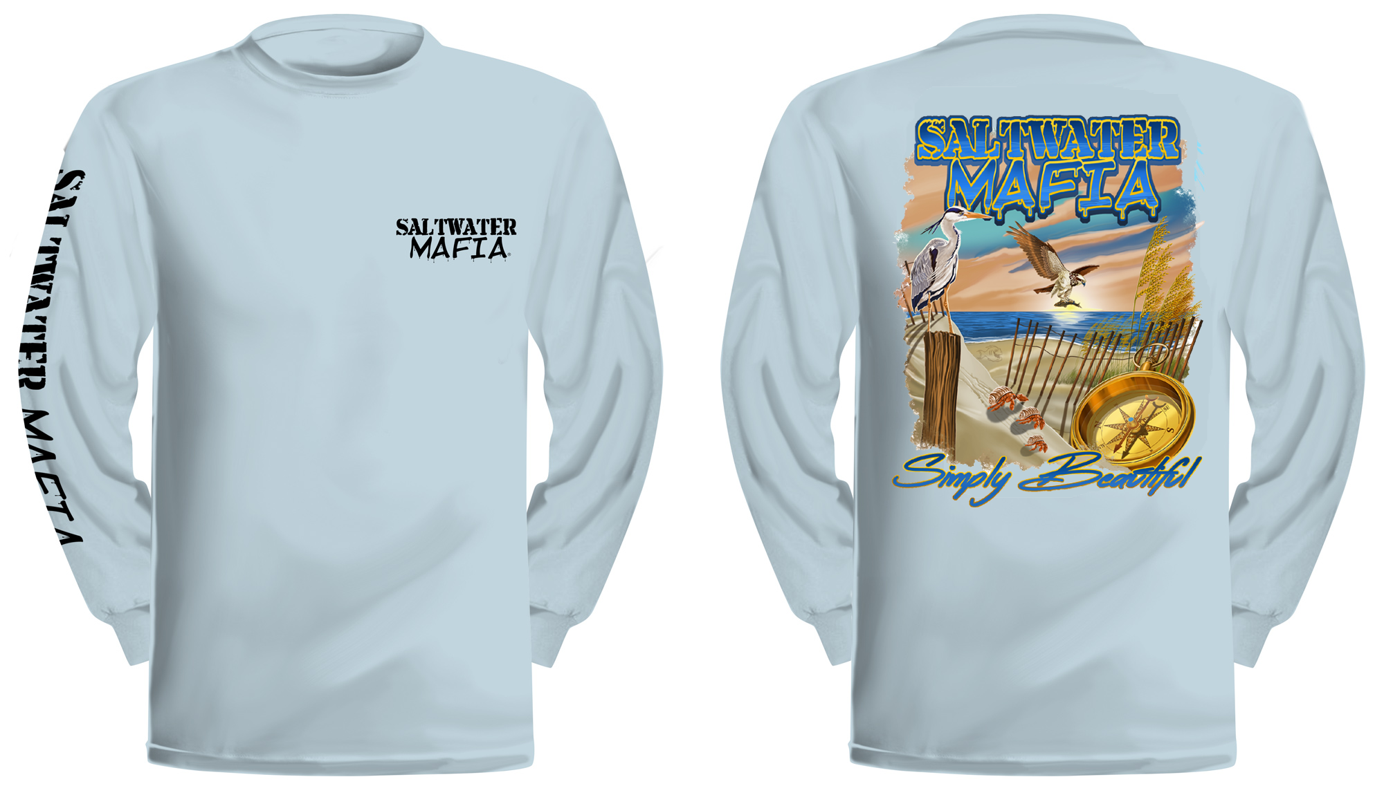 Simply Beautiful long-sleeve quick dry UV protectant shirts. Features ProtectUV (r) for UPF 50+ Mega Solar protection with WIKZ (r) moisture wicking and ZYPTRON (r) stain release. Double Needle Tailoring. Shirt may have Saltwater Mafia or the Mobster Fish on the front chest. Sizes S-3XL. $2 more for 2 & 3 XL. Design is on shirt back. Unisex.