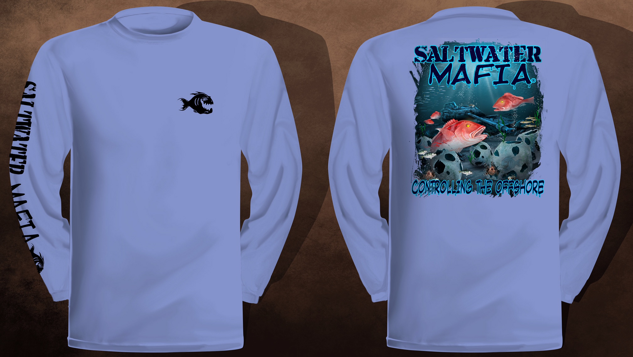 Snapper Reef long-sleeve quick dry UV protectant shirts. Features ProtectUV (r) for UPF 50+ Mega Solar protection with WIKZ (r) moisture wicking and ZYPTRON (r) stain release. Double Needle Tailoring. Shirt may have Saltwater Mafia or the Mobster Fish on the front chest. Sizes S-3XL. $2 more for 2 & 3 XL. Design is on shirt back. Unisex.