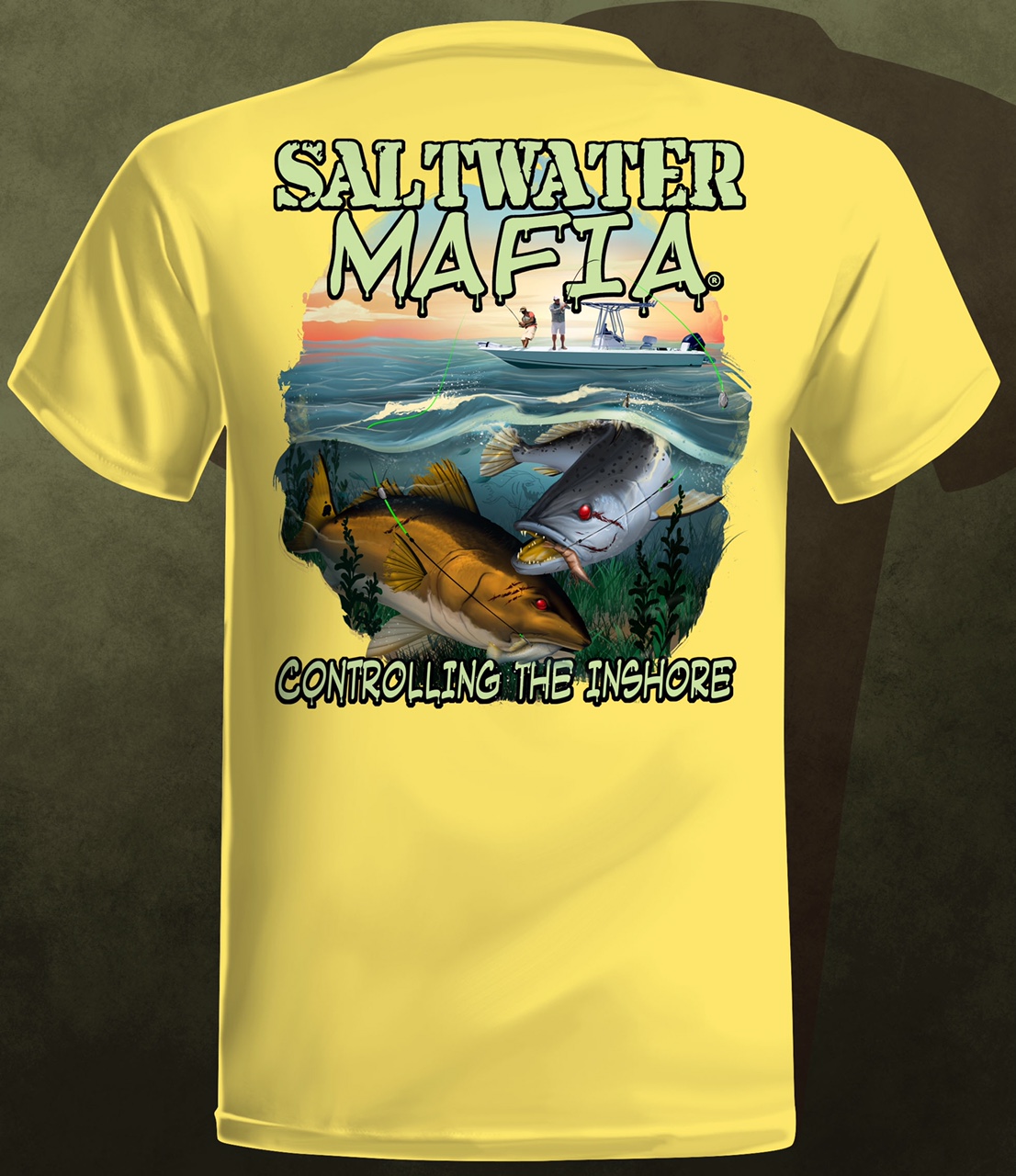 Speck & Redfish Short Sleeve quick dry UV protectant shirts. Features ProtectUV (r) for UPF 50+ Mega Solar protection with WIKZ (r) moisture wicking and ZYPTRON (r) stain release. Double Needle Tailoring. Shirt may have Saltwater Mafia or the Mobster Fish on the front chest. Sizes S-3XL. $2 more for 2 & 3 XL. Design is on shirt back. Unisex.