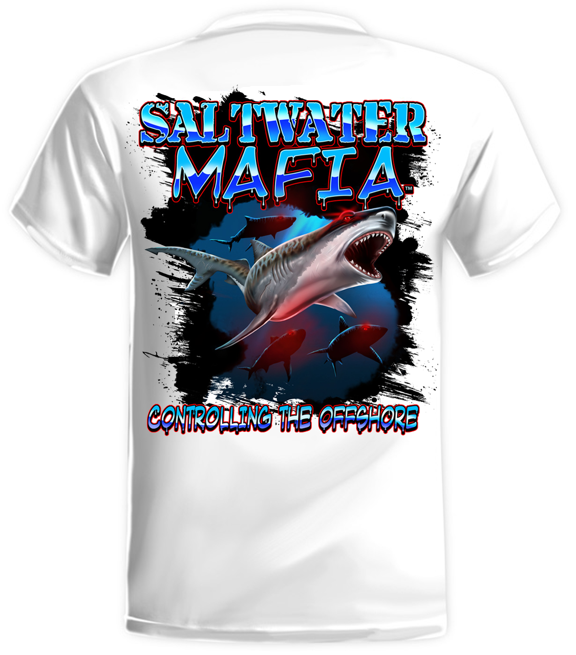 Tiger Shark quick dry UV protectant shirts. Features ProtectUV (r) for UPF 50+ Mega Solar protection with WIKZ (r) moisture wicking and ZYPTRON (r) stain release. Double Needle Tailoring. Shirt may have Saltwater Mafia or the Mobster Fish on the front chest. Sizes S-3XL. Design is on shirt back. Unisex.