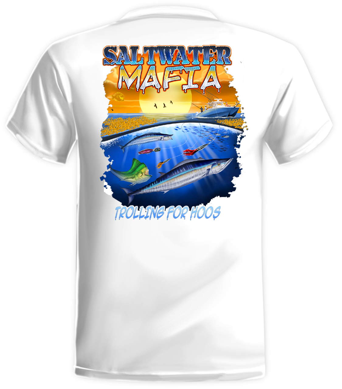 Trolling For Hoos quick dry UV protectant shirts. Features ProtectUV (r) for UPF 50+ Mega Solar protection with WIKZ (r) moisture wicking and ZYPTRON (r) stain release. Double Needle Tailoring. Shirt may have Saltwater Mafia or the Mobster Fish on the front chest. Sizes S-3XL. Design is on shirt back. Unisex.