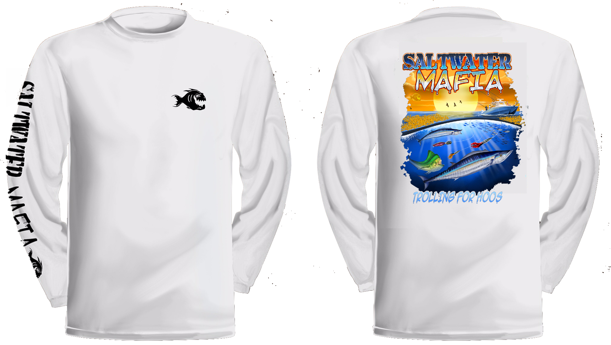 Trolling For Hoos long-sleeve quick dry UV protectant shirts. Features ProtectUV (r) for UPF 50+ Mega Solar protection with WIKZ (r) moisture wicking and ZYPTRON (r) stain release. Double Needle Tailoring. Shirt may have Saltwater Mafia or the Mobster Fish on the front chest. Sizes S-3XL. $2 more for 2 & 3 XL. Design is on shirt back. Unisex.