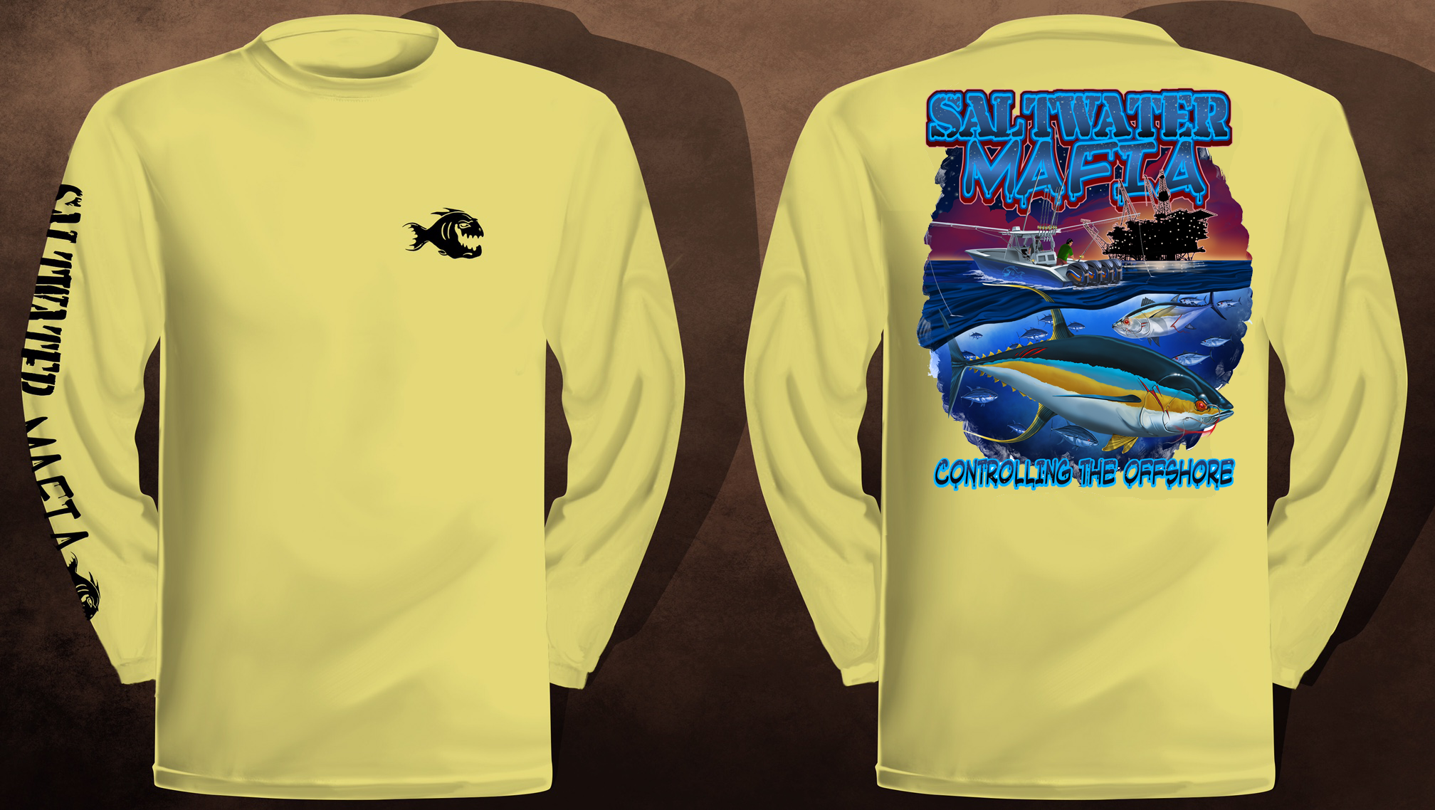 Tuna Rig long-sleeve quick dry UV protectant shirts. Features ProtectUV (r) for UPF 50+ Mega Solar protection with WIKZ (r) moisture wicking and ZYPTRON (r) stain release. Double Needle Tailoring. Shirt may have Saltwater Mafia or the Mobster Fish on the front chest. Sizes S-3XL. $2 more for 2 & 3 XL. Design is on shirt back. Unisex.