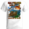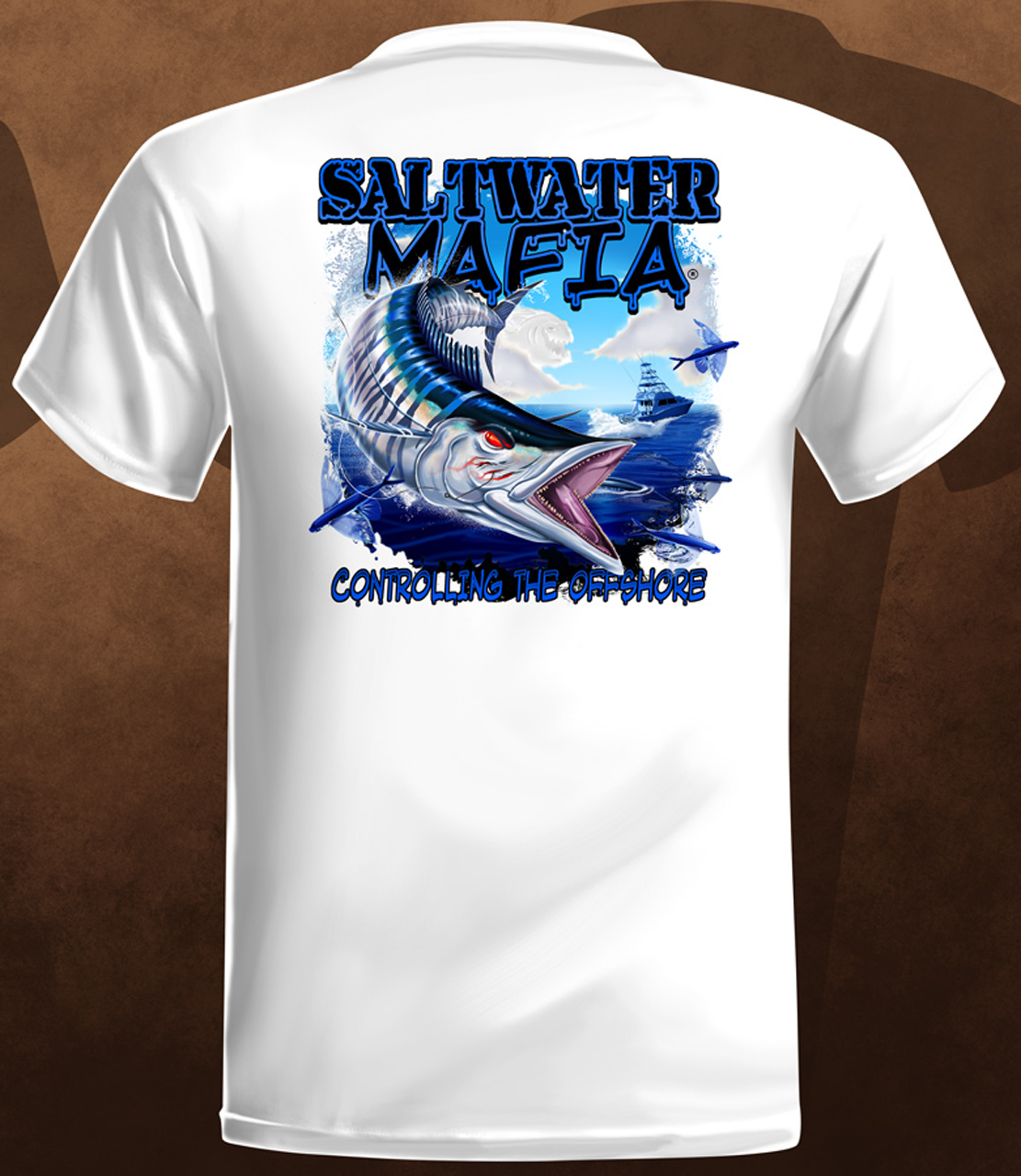 Wahoo quick dry UV protectant shirts. Features ProtectUV (r) for UPF 50+ Mega Solar protection with WIKZ (r) moisture wicking and ZYPTRON (r) stain release. Double Needle Tailoring. Shirt may have Saltwater Mafia or the Mobster Fish on the front chest. Sizes S-3XL. $2 more for 2 & 3 XL. Design is on shirt back. Unisex.