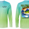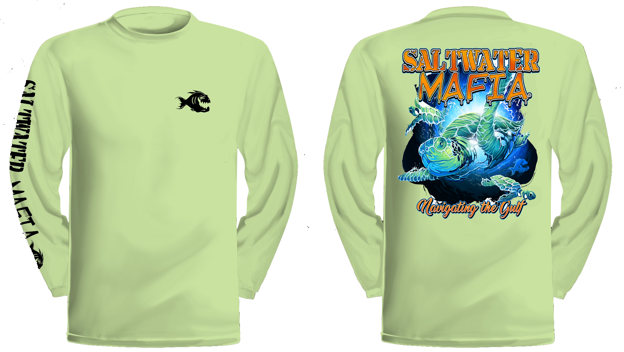 Sea Turtle long-sleeve quick dry UV protectant shirts. Features ProtectUV (r) for UPF 50+ Mega Solar protection with WIKZ (r) moisture wicking and ZYPTRON (r) stain release. Double Needle Tailoring. Shirt may have Saltwater Mafia or the Mobster Fish on the front chest. Sizes S-3XL. $2 more for 2 & 3 XL. Design is on shirt back. Unisex.